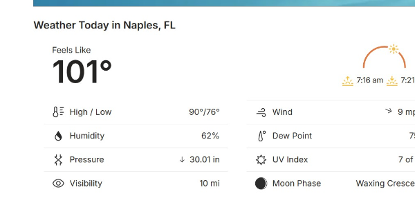 Mother Nature has her own calendar here in Naples, FL. The heat and humidity are making it tough, but still getting on the bike for at least an hour a day!