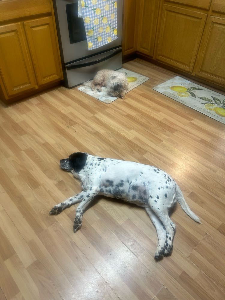 Scout stretching after my run with me