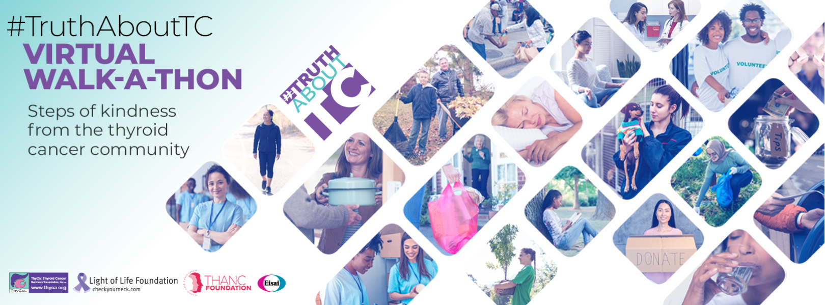 ThyCa:Thyroid Cancer Survivors’ Association, Inc., the Light of Life Foundation, the Thyroid, Head and Neck Cancer (THANC) Foundation and Eisai Inc. have joined forces to bring back the #TruthAboutTC Virtual Walk-a-Thon this Thyroid Cancer Awareness Month! Last year, hundreds of people stepped up to raise awareness of thyroid cancer (TC) by walking nearly 29 million steps! This year, we’re challenging you to go above and beyond to help harness the community’s passion. How can we bring more light into the world while we raise TC awareness? By spreading kindness. In addition to counting steps or their fitness equivalent, we’ve added a new category for people to participate in: acts of kindness. Whether you choose to do good for others, or need to start from within, the world is a better place when we practice kindness. Here’s how it works: each act of kindness you perform during the walk-a-thon counts as a certain number of steps. The more generous the activity, the more steps you achieve. See the table below for more information. It’s a little different, but after the past couple of years, we can all use more kindness in our lives. We hope you join us and encourage your friends and family to get involved as well in raising awareness and donations!