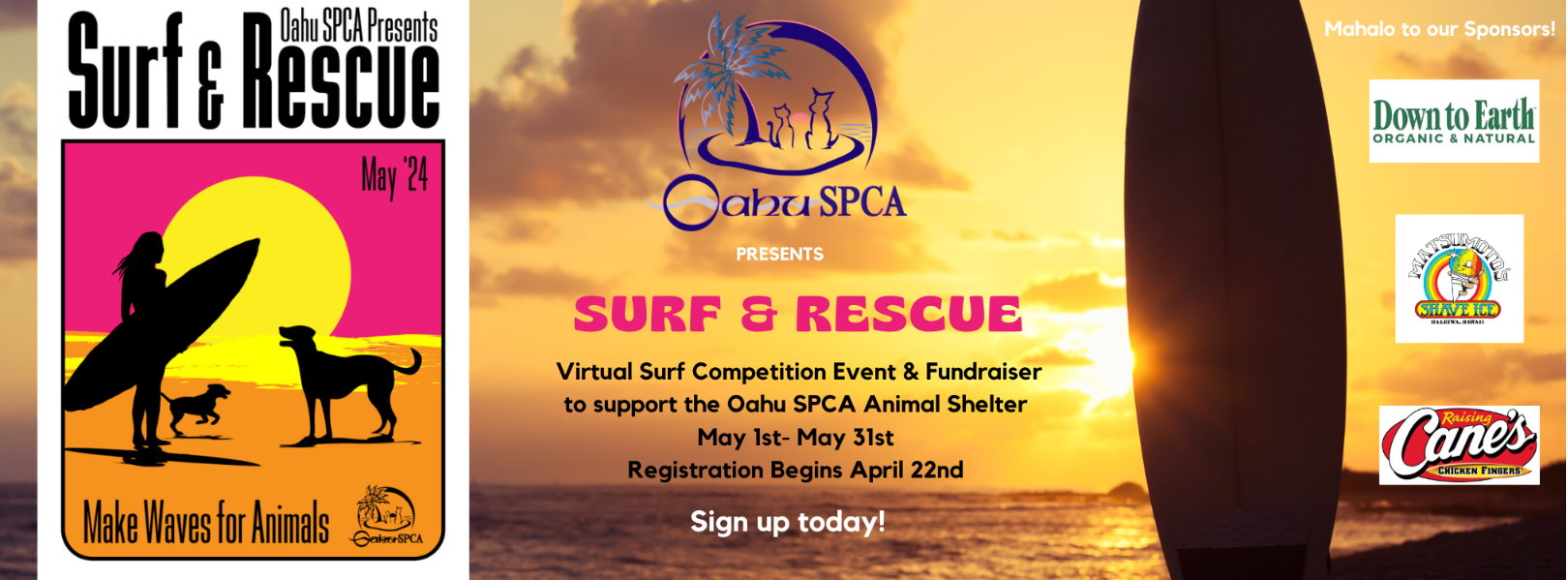 Registration: $25/participant (proceeds go toward your overall fundraising goal) and includes access to your own Oahu SPCA "Surf & Rescue" fundraising site.