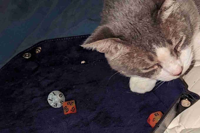 Nova helping me roll during my weekly DND/role playing session. It's important to take time to unwind and reconnect with friends.